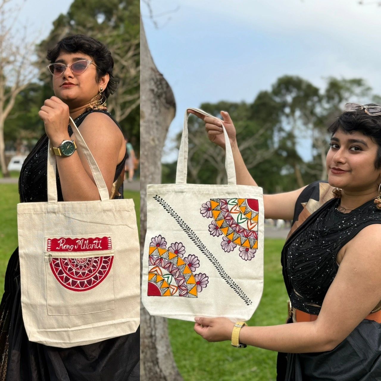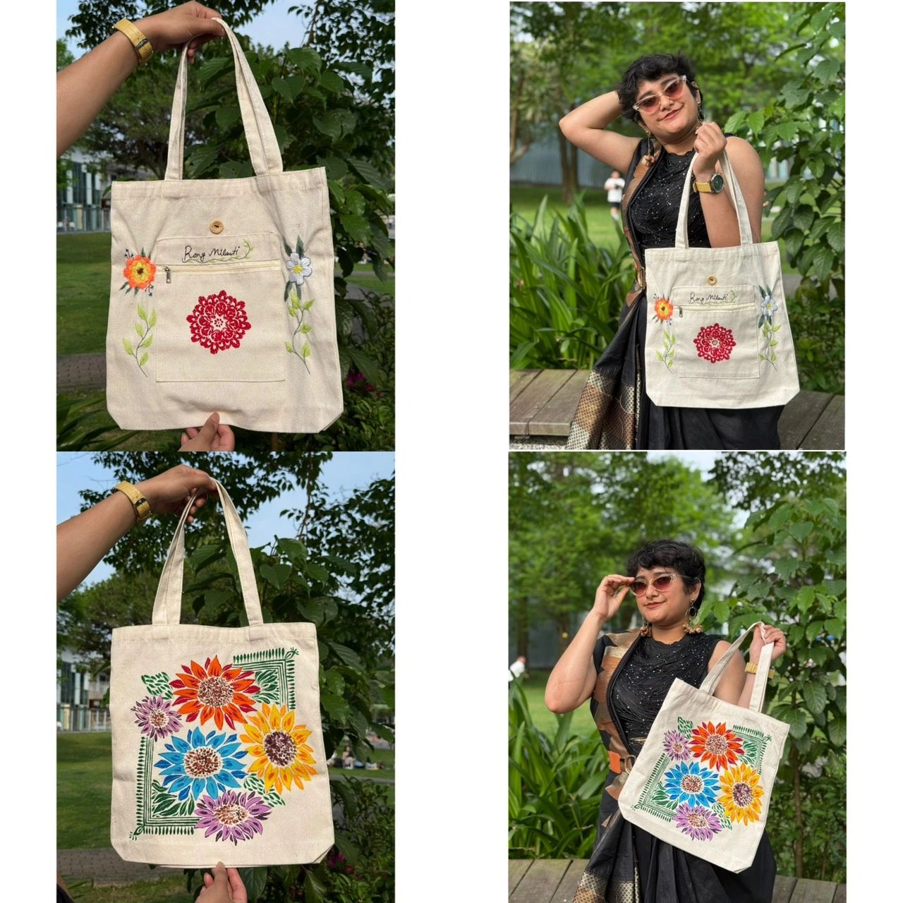All the tote bags (canvas cloth) are original artwork, both painted and embroidered on both sides. The size of each bag is 40 x 35 cm. It also has an outside pocket with a zip lock. These bags are washable, and it is recommended to wash them using cold water only.